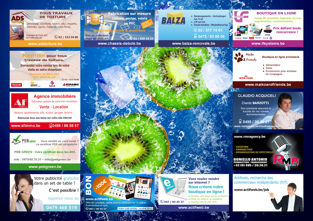 Notre set de table publicitaire standard se présente sous un format A3 (420 mm x 297 mm) avec un maximum de 14 encarts publicitaire de 90 mm x 50 mm en couleur quadrichromie (demande de prix).